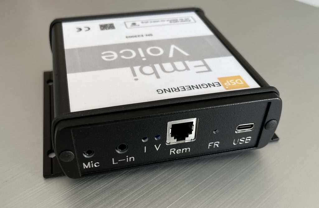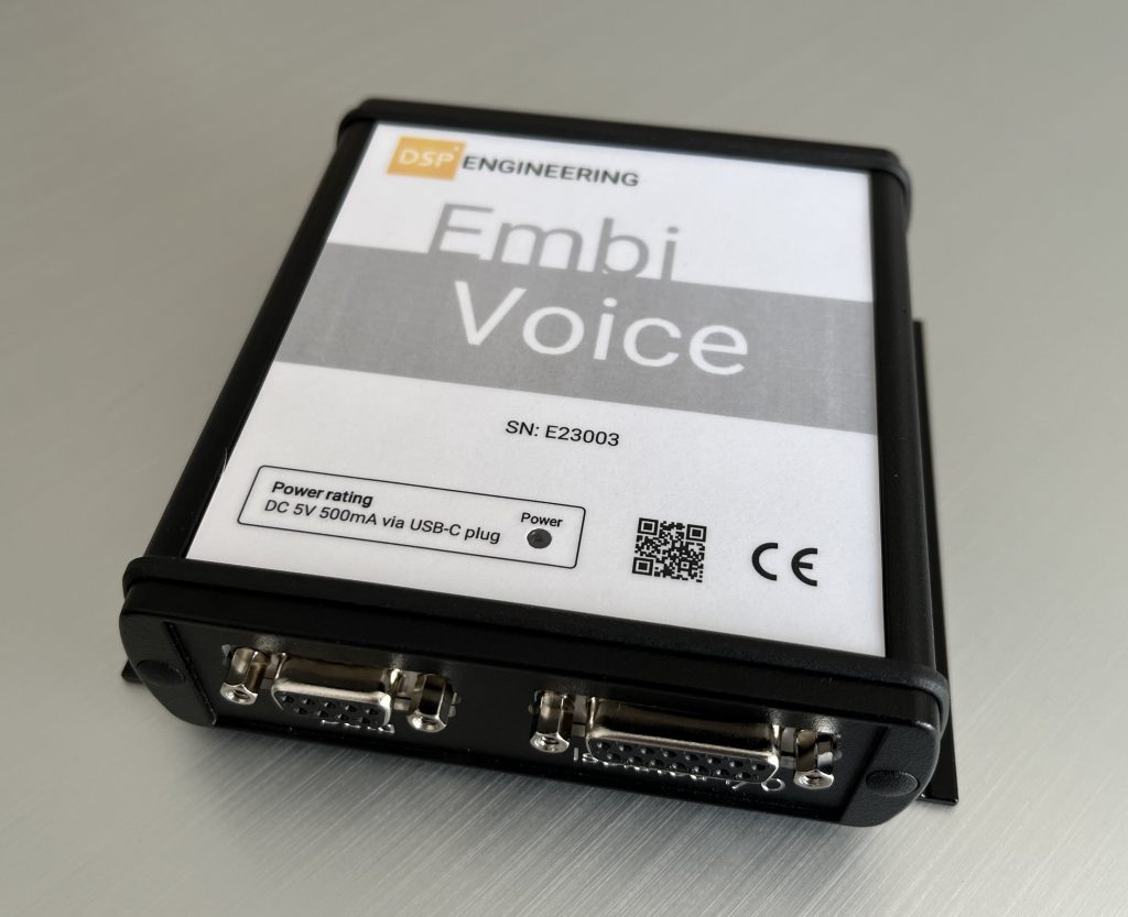 „Keep it simple“ war die Devise bei der Entwicklung der Schnittstelle: Die verwendete USB-Schnittstelle von Microchip ist unter gängigen Windows- und Linux-Versionen plug and play verwendbar ohne spezielle Treiber zu installieren. Für Geräte die kein USB ermöglichen, bietet EmbiVoice eine serielle TIA/EIA-232 Schnittstelle.